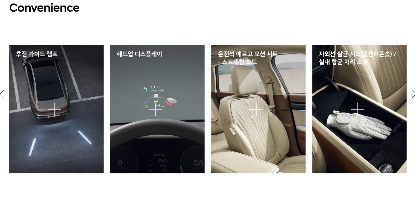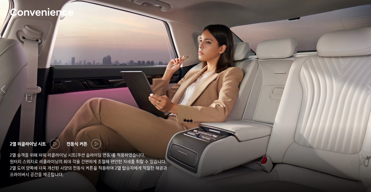 각종 편의기능은 거의 모든 옵션을 가지고 있다고 볼 수 있다. 물론 차량의 등급과 오셥 선택에 따라 달라지겠지만, 선택의 폭이 넓다. 벤츠 S클래스에서 볼수 있는 증간현실 내비게이션이 가능하고, 정체구간 특화제어, 서라운드뷰모니터와 실내 지문 인증 시스템으로 차량 내 간편결제와 시동, 주행이 가능하다. 또 2열은 리클라이닝 시트와 전동식 커튼도 가능하여 편안함과 고급스러움, 프라이버시까지 제공한다.