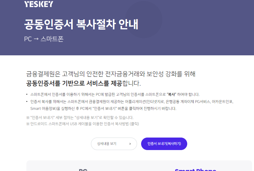 2. PC 에서 smart yessign 접속 : 금융결제원 전자인증센터인 smart yessign or kr 에 접속합니다. 여기서 인증서를 휴대폰으로 내보낼수 있습니다.